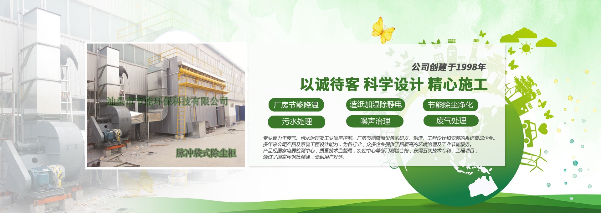 汕頭市節(jié)能環(huán)??萍加邢薰緞?chuàng)建于1998年,是一家專業(yè)致力于廢氣、污水、粉塵、噪聲治理,廠房節(jié)能降溫設(shè)備的研發(fā)、制造、工程設(shè)計和安裝的系統(tǒng)集成企業(yè)。多年來公司產(chǎn)品及系統(tǒng)工程設(shè)計能力,為各行業(yè),眾多企業(yè)提供了品質(zhì)高的環(huán)境治理及工業(yè)節(jié)能服務(wù)。產(chǎn)品經(jīng)國家電器檢測中心,質(zhì)量技術(shù)監(jiān)督局,疾控中心等部門測驗合格,獲得五次技術(shù)專利;工程項目通過了國家環(huán)保檢驗檢測,受到用戶好評。